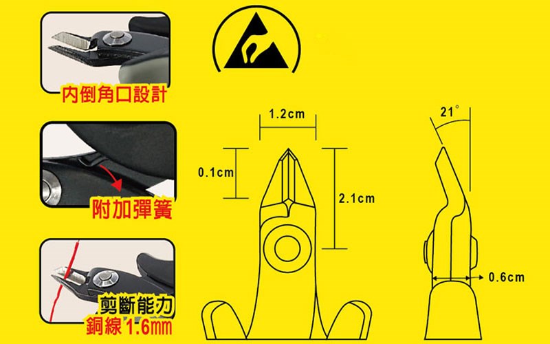 ●永久防靜電 ●斜口鉗。 ●附彈簧,自動開口操作省力順暢。 ●舒適握柄好握易使用。 產品材質:導電母、橡膠。
