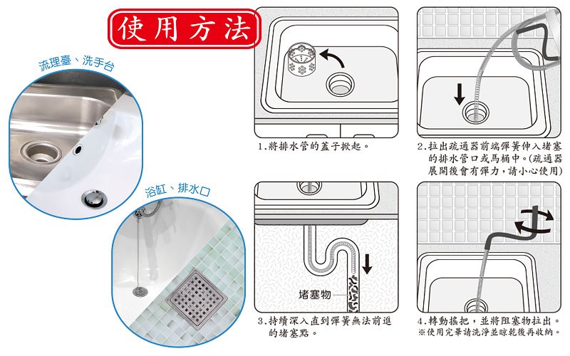 主要用途: ●馬桶、流理台、浴室排水口等各式水管疏通。 產品特色: ●使用鐵夾收納更方便,操作簡單。 產品材質:聚氯乙烯、鍍鋅銅線。