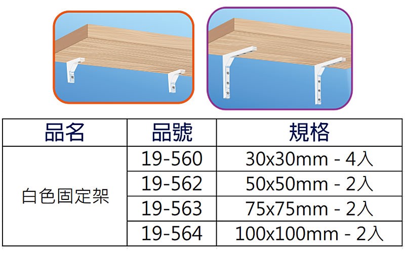 產品數量:2入(內附螺絲) 主要用途: ●居家DIY、木工裝潢、層板,固定、支撐等作用。 產品特色: ●安裝簡易。 ●方便、輕巧、多用途。 產品材質:鐵。