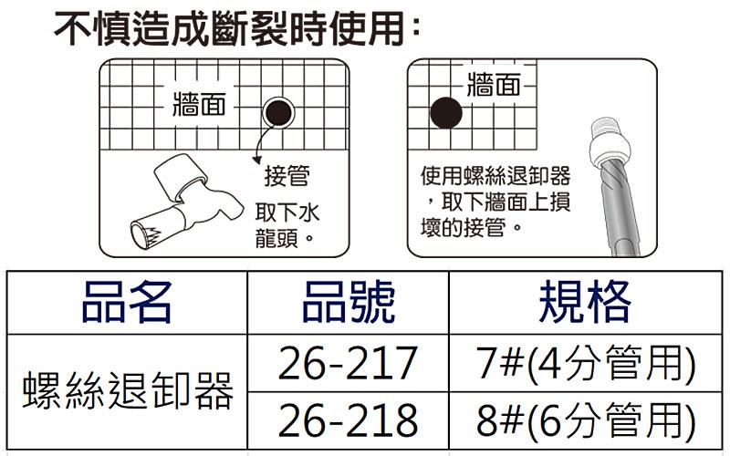 產品品號:26-217 4分管(1.27公分)用 適用於水龍頭或接管之斷裂或 破裂後,退牙取出使用。