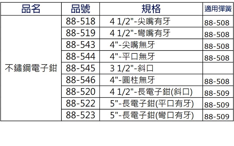 主要用途: ●適用於汽車修護、電器、土木水電、家庭DIY等。 產品特色: ●多種用途使用方便。 產品材質:不鏽鋼、聚氯乙烯。 ( 適用 88-508 電子鉗彈簧-2入 )