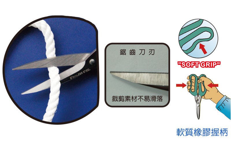 主要用途: ●園藝、模型、辦公室、廚房、DIY等使用。 產品特色: ●單邊鋸齒狀不鏽鋼刀刃,止滑、鋒利。 ●人體工學軟柄握把,舒適長久使用不疲勞。 ●裁剪力強,刀刃鋒利,使用輕鬆省力,順暢舒適。 產品材質:聚氯乙烯、不鏽鋼。
