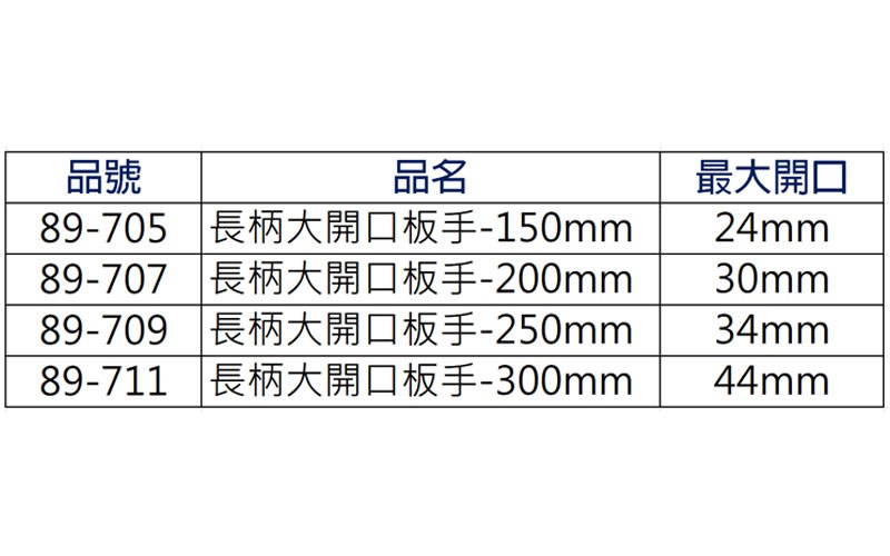 主要用途: ●適用於汽車、土木、水電、機械等維修使用。 ●工廠、家庭DIY等安裝與拆卸螺絲。 產品特色: ●超大開口,使用範圍廣。 ●合金鋼鍛造輕量化大開口板手,重量比同規格輕約百分之30。 ●板手尾端有掛孔,攜帶方便易收納。 產品材質:中碳鋼、聚氯乙烯。