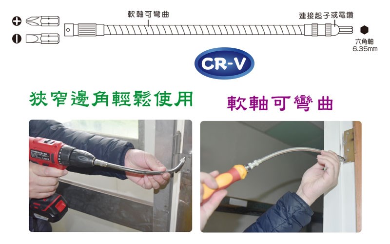 主要用途: ●拆裝螺絲等,使用範圍廣。 ●適用於汽車修護、機械組立、電器工程、居家DIY。 產品特色: ●可彎曲的軟軸,用於狹窄或不易安裝拆卸的邊角、孔穴位置操作使用。 產品材質:鉻釩鋼(CR-V)+噴砂。 *適用於夾頭式可調低速扭力充電電鑽、起子機上(扭力過大會導致軟軸受損)或可更換手動起子 。