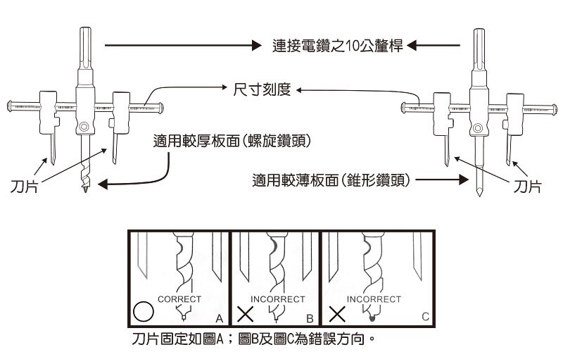 產品品號:05-402 薄厚板面皆適用。 多功能切洞器。 高碳鋼切割刀片。