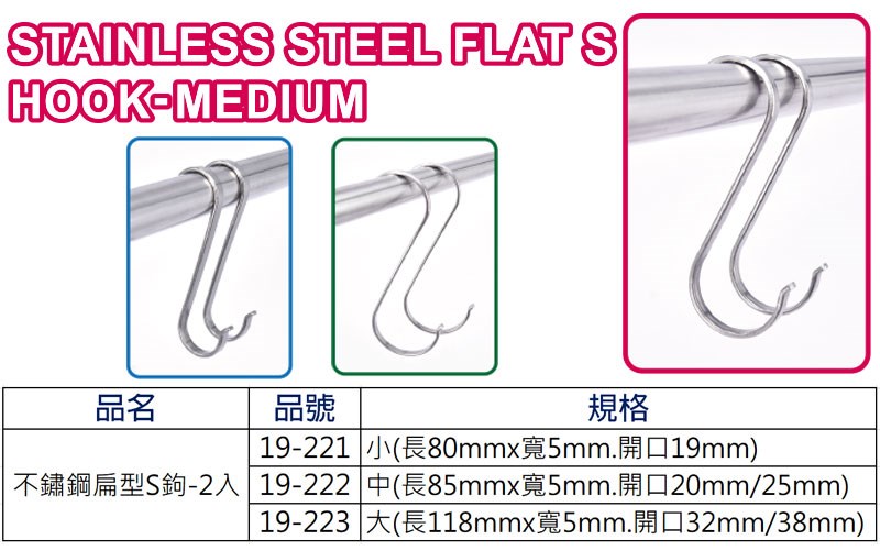 產品數量:2入 主要用途: ●露營、DIY等懸掛物品。 產品特色: ●S型設計,可與吊桿配合多用途、簡易、輕巧、重心穩、防落設計。 產品材質:304不鏽鋼。