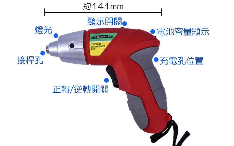 配 件:25mm 螺絲起子頭x18、60mm 磁性螺絲起子接桿x1、 轉雙頭式螺絲起子頭x2、木材/金屬通用鑽頭x3、充單器x1 充電電壓:110伏特/60赫茲 轉 速:180每分鐘轉速 充電時間:每次充電至少5小時 主要用途: ●電子產品、機器設備拆裝螺絲,家庭DIY裝修等。 產品特色: ●具正/逆轉功能。 ●重量、體積輕巧攜帶方便。 產品材質:橡膠、樹脂、電子零件。