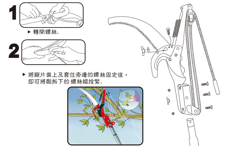 產品規格: ●鋸片 1.0mm x 14" ●繩 139" (本產品不含桿子) 主要用途: ●利用滑輪,可輕鬆剪斷樹枝。 產品特色: ●組裝簡易。 產品材質:高碳鋼。 ( 適用 20-301 二節伸縮鋁桿50"-96" )