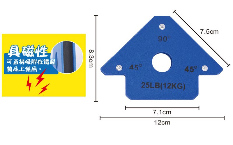 主要用途: ●固定角度用。 ●可直接吸附鐵製物品上,進行焊接、裝配、銜接、標記、拼裝等多用途。 產品特色: ●具有磁性。 ●箭頭形狀設計,可多角度使用(45度、90度和135度)。 產品材質:碳鋼、氧化鐵。
