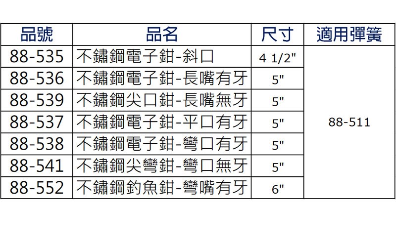 主要用途: ●電子、珠寶加工、DIY、釣魚業等精細產品使用。 產品特色: ●多種用途使用方便。 產品材質:不鏽鋼、聚氯乙烯。 ( 適用 88-511 不鏽鋼電子鉗彈簧-2入 )