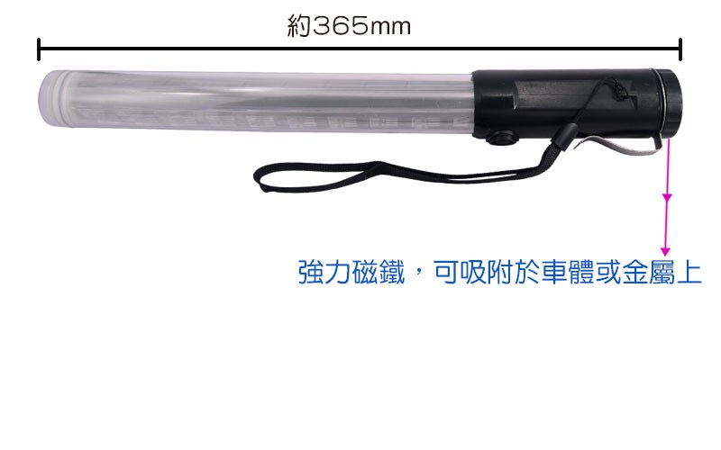 主要用途: ●交管指揮、巡邏、故障警示、夜間照明等使用。 產品特色: ●六段按壓式開關。 (紅色閃爍、藍色閃爍、紅/藍交叉閃爍、紅/藍快速交叉閃爍、前端白色照明、關) 產品材質:聚氯乙烯、磁鐵、白鐵。 ( 使用 AA 三號電池x3,請使用一般碳鋅電池 )