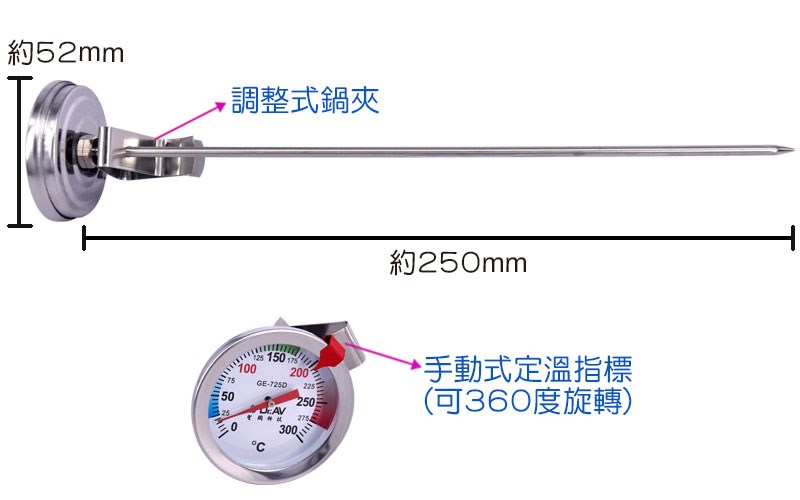 產品品號:K725D 0°C~300°C 加長型多用途不鏽鋼溫度計。 調整式鍋夾設計。