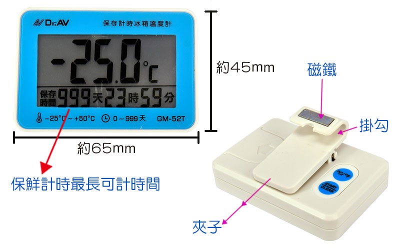 測量範圍: -25°C~50°C 主要用途: ●家用冰箱、餐廳甜點、冰櫃、超市冷藏、冷凍櫃、醫藥存儲。 產品特色: ●可夾於指定食物計時。 ●可吊掛、可立放、可磁吸、可夾。 ●°C/°F單位切換鍵。 產品材質:聚苯乙烯。 ( 使用電池CR2032x1(使用前請先移除絕緣片) )